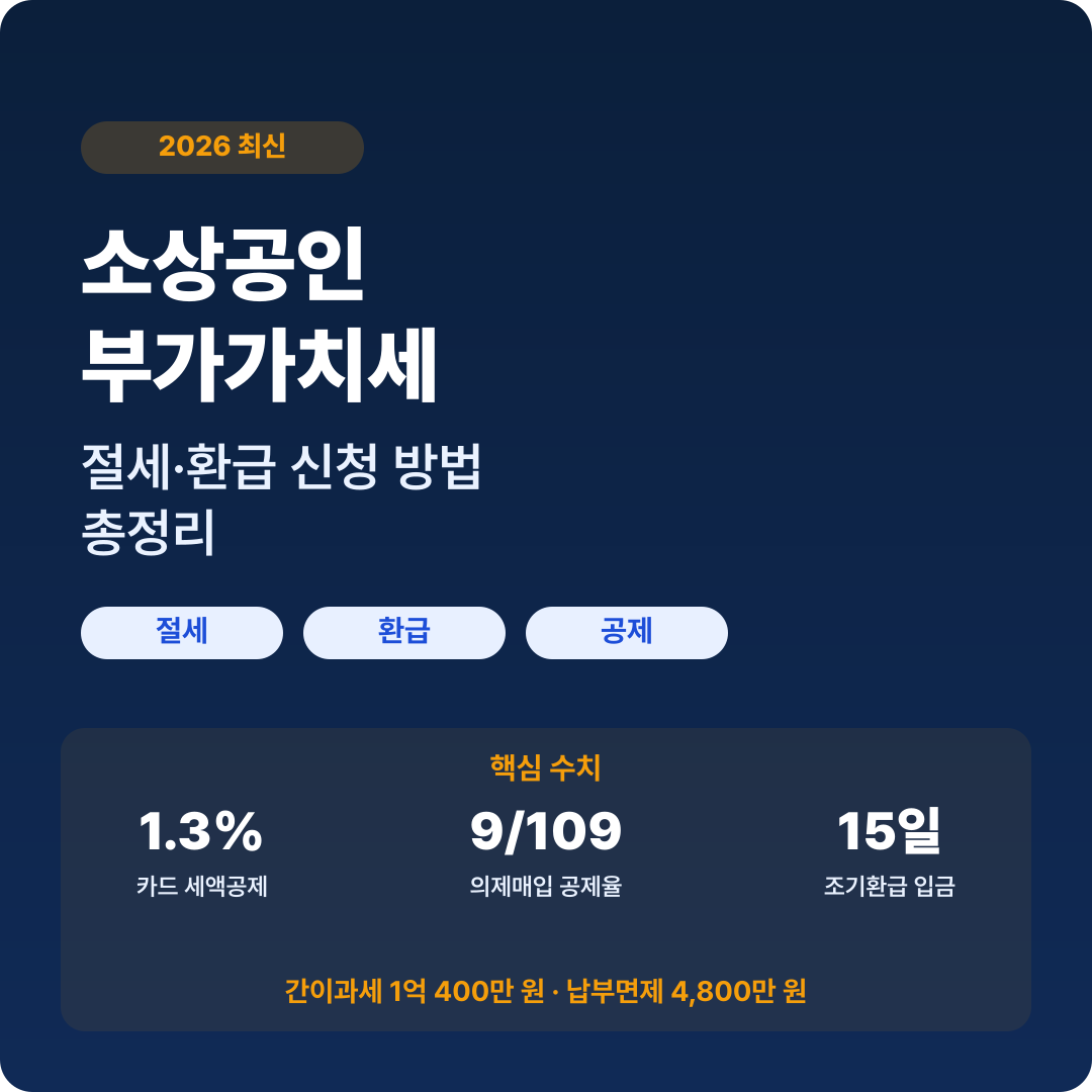 2026년 소상공인 부가가치세 절세·환급 방법을 총정리합니다. 간이과세 기준 1억 400만 원, 의제매입 9/109, 신용카드 발행 세액공제 1.3%(연 1,000만 원), 조기환급 15일, 매입세액 공제 극대화 전략, 가산세 방지까지 한눈에 확인하세요.
