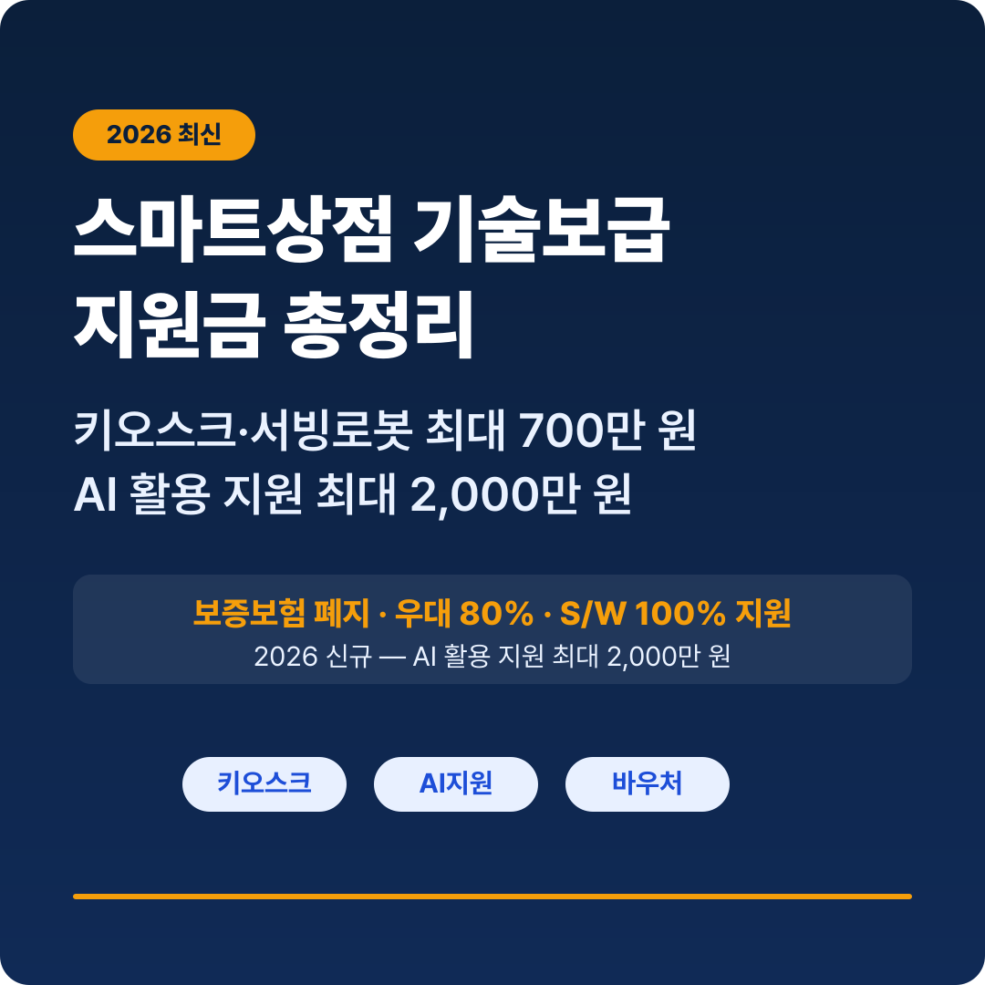 2026년 소상공인 스마트상점 기술보급 사업 — 키오스크·서빙로봇·AI 솔루션 최대 700만 원 지원, AI 활용 신규 사업 최대 2,000만 원, 경영안정 바우처 25만 원까지 신청 방법과 자부담 구조를 정리합니다.