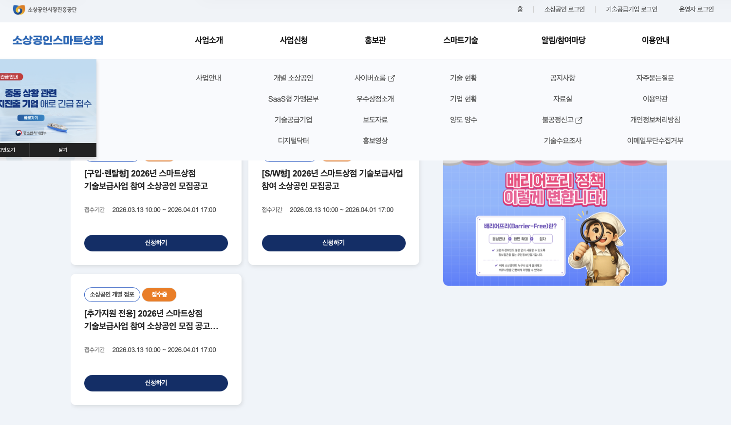 2026년 스마트상점 기술보급 공고는 3월 중순 예정입니다. 예산 소진 시 조기 마감될 수 있으니 공고 즉시 신청하세요. 2026년부터 지급보증보험 가입 의무가 폐지되어 신청이 한결 편해졌습니다.