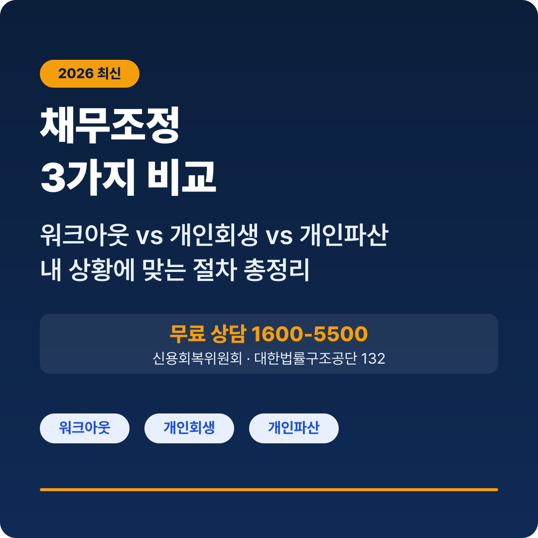 2026년 채무조정 3가지(신용회복위원회 워크아웃·개인회생·개인파산) 대상·채무 한도·변제율·소요 기간·신용회복 시점을 비교하고, 내 상황에 맞는 절차를 안내합니다.